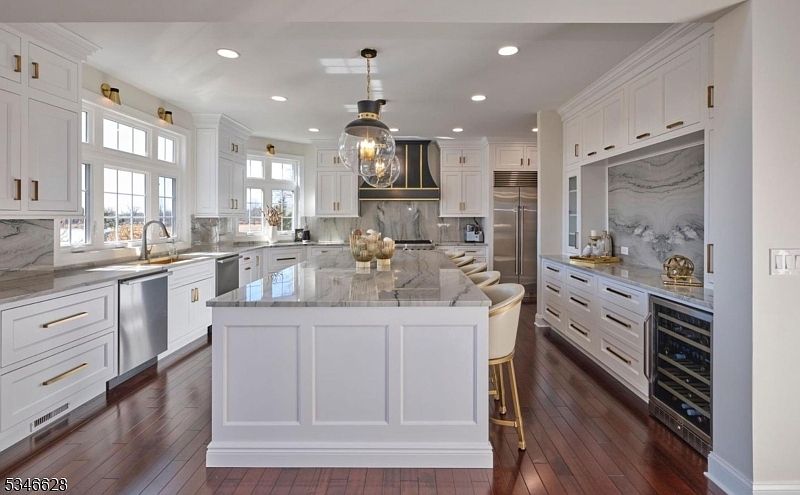 This custom kitchen combines timeless elegance with modern convenience, featuring white cabinetry, quartzite countertops, and a large island. High-end appliances and a dedicated coffee and wine bar create a space that’s both beautiful and practical.